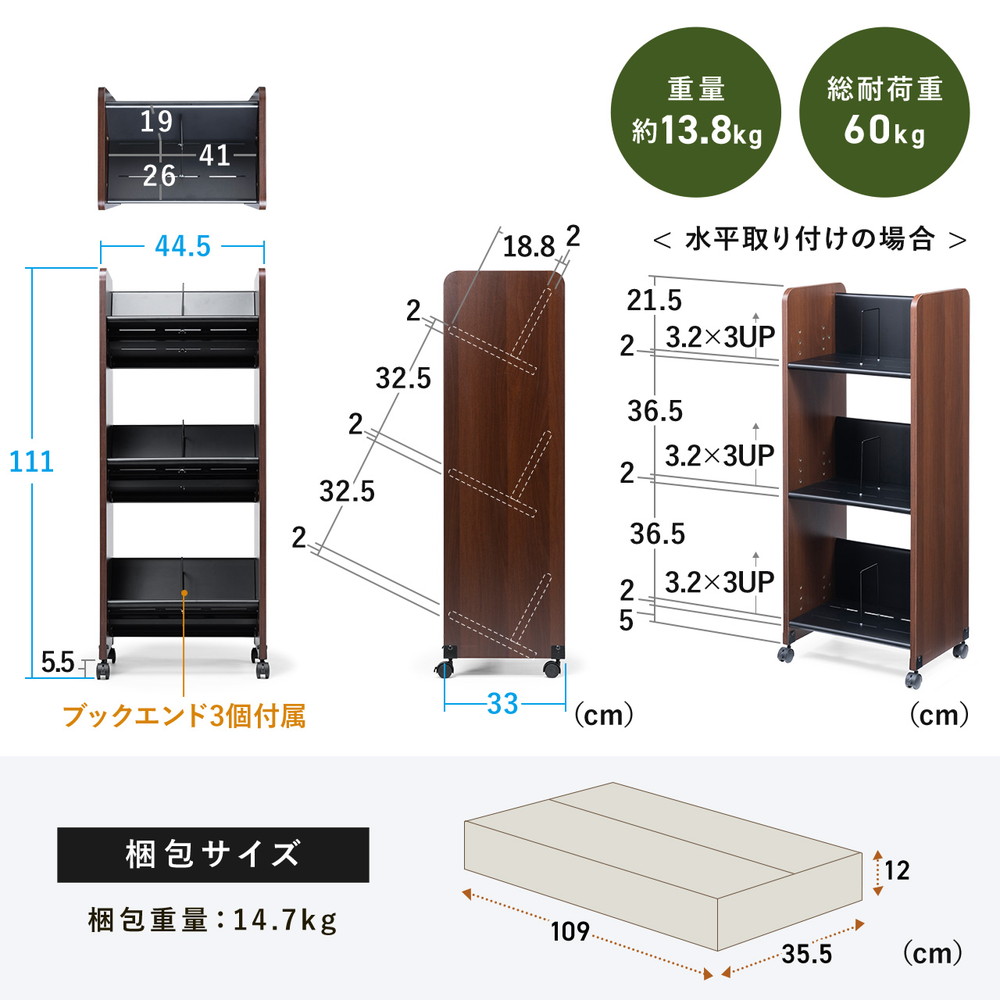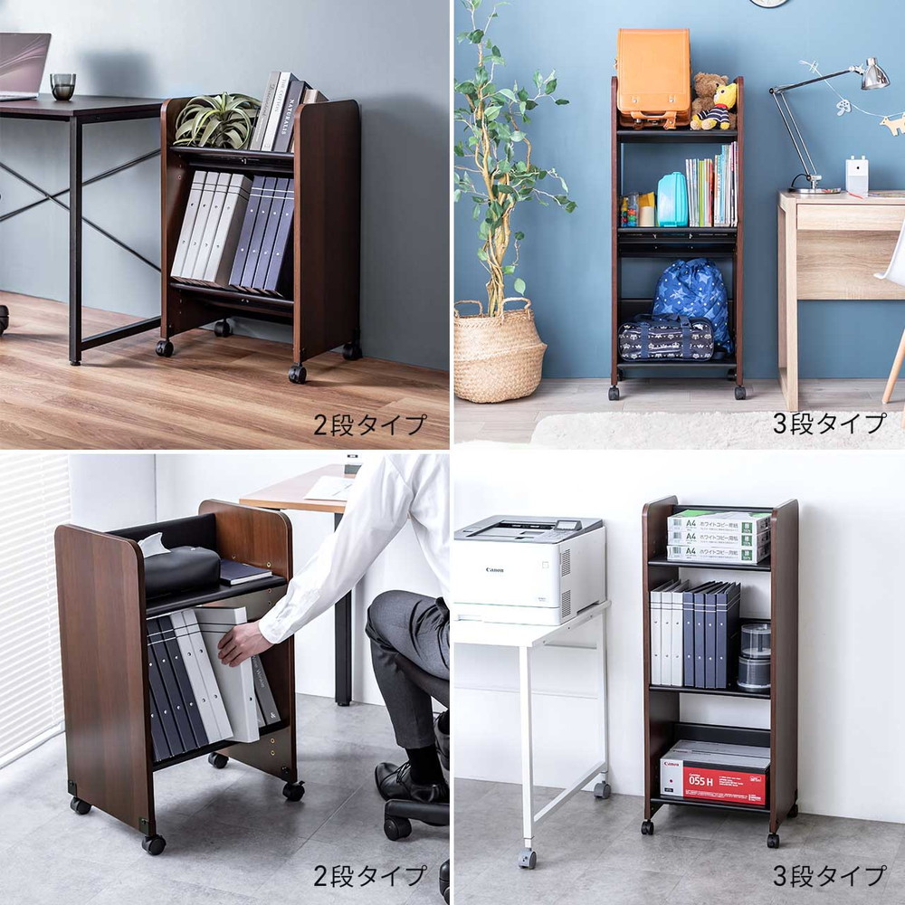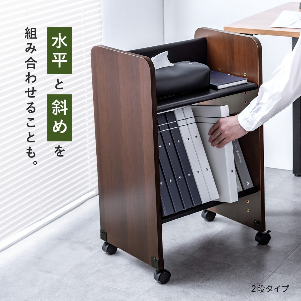 A4収納が可能で、キャスター付きのファイルワゴン。棚板は水平にも斜め棚にもできる2WAY仕様。オフィスや家庭向けの、本棚・ファイル収納、バッグやランドセル収納に最適。