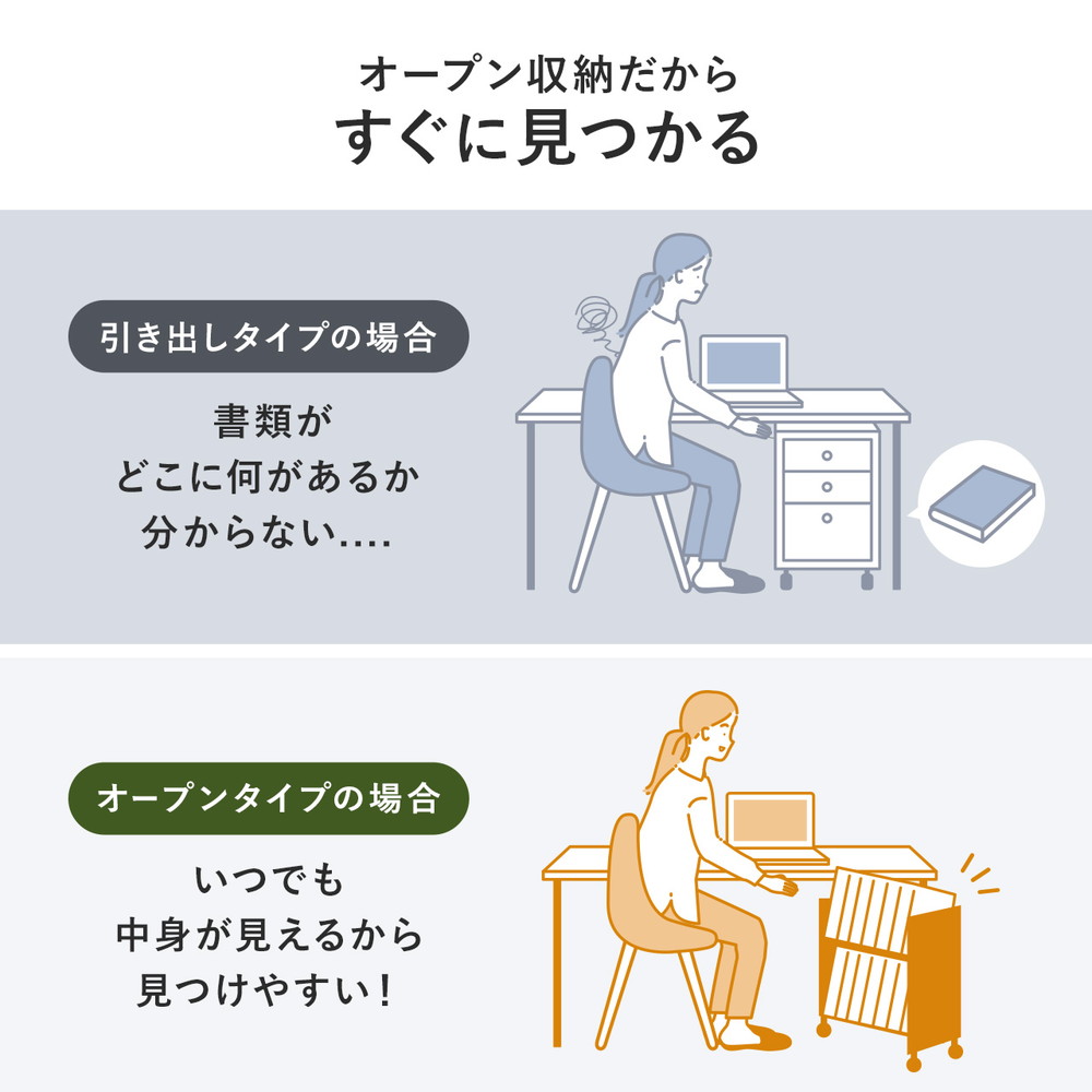 ●必要なものをすぐ見つけられて簡単に取り出しできるファイルワゴンです。