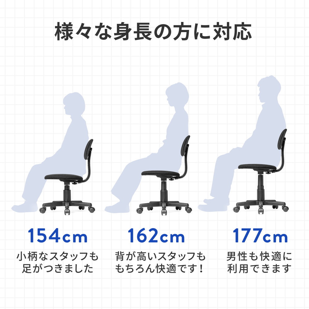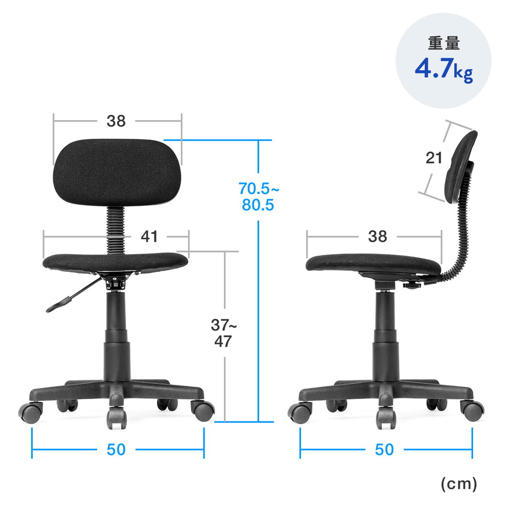 レバー操作で高さ調整可能なガス圧式。座面高375〜470mmの低座面設計。背もたれチルト機構で負担軽減。圧迫感のないコンパクト設計。軽量設計で移動や模様替えが容易。シンプル構造のリーズナブル設計。