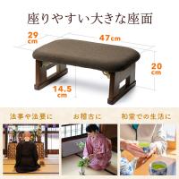 長時間の正座も楽にできる折りたたみ可能な、正座椅子。足のしびれを防ぎ、正しい姿勢で座ることができる。あぐらをかいたり、スツールとしても使える。使用しない時は脚を折りたたんでコンパクトに収納可能。軽量で持ち運びしやすく、法事や法要などに最適。脚裏に傷防止と滑り止めを兼ねたフェルト付き。茶色。