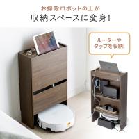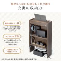 ケーブル、タップなどが収納でき、iPhoneなどのスマートフォンやiPadなどのタブレットを上部に設置可能。ルーターやモデムなども収納できる木製収納ボックス。ルンバなどのロボット掃除機の設置も可能。ケーブル整理やスマホの充電に便利なスタンド機能付きケーブルボックス。電波障害が少ないオール木製。幅40cm。