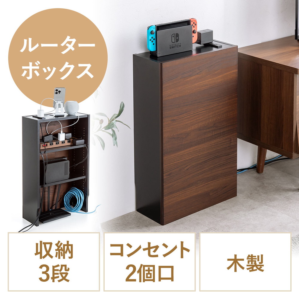 ルーター収納ボックス ケーブルボックス 幅40cm 高さ65cm コンセント付き 木製 スリム 壁面収納 電話台 ダークブラウン 200-CB045DBRM サンワサプライ