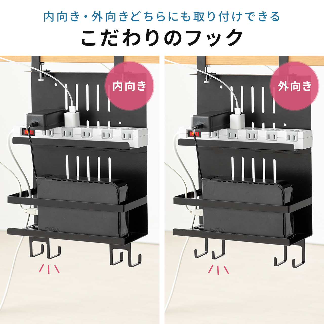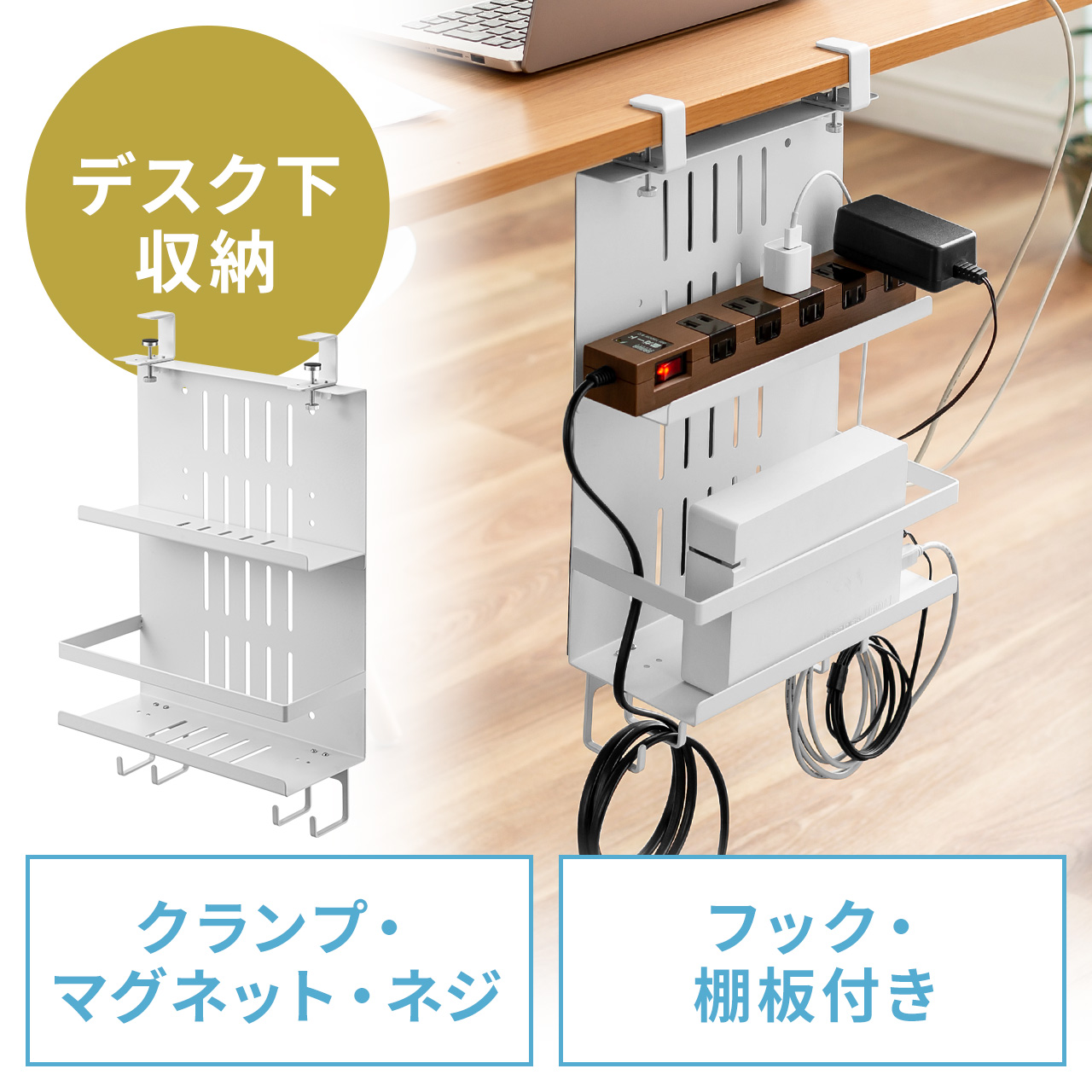 ●電源タップとケーブルを収納し、デスクに後付けできるデスク下収納ラックです。