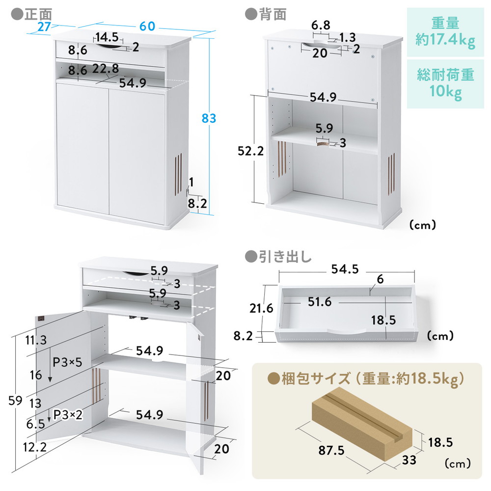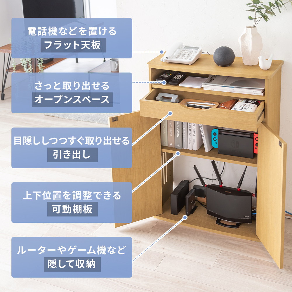 大型ルーターやモデム、電源タップや生活雑貨が収納でき、電話台としても使用できる木製収納ラック。扉付きで見た目もスッキリ。小物の整理に便利な引き出し付き。幅60cm、奥行き27cm、高さ83cm。