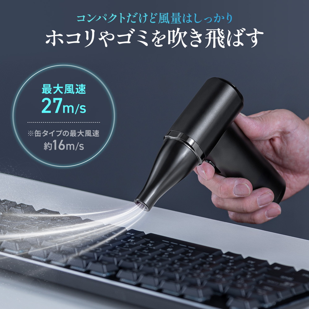 ガス不要のType-C充電式電動エアダスター。約6m/s?27m/sの無段階風速調整に対応し、2種のノズルで幅広い用途に活躍する。充電スタンド付きで置くだけ簡単充電、使用後はスタンドに戻すだけで常にフル充電状態を保てる。省スペースで収納性も高く、日常使いに最適な1台。