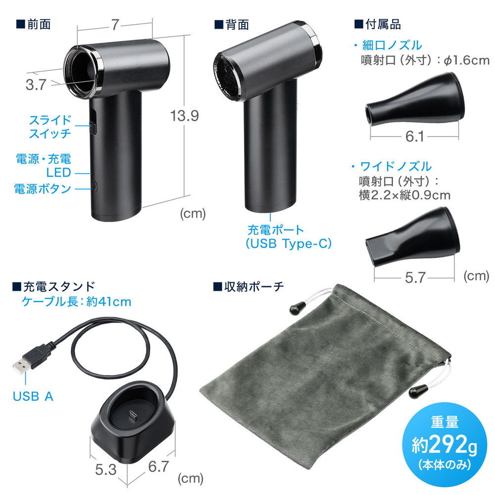 ■付属品:電動エアダスター、充電スタンド、取扱説明書、細口ノズル、ワイドノズル、収納ポーチ