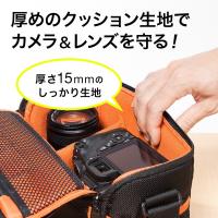 一眼カメラ本体と交換用レンズ収納が可能で、ダブルズームキット一式の収納に最適なカメラバッグ。ショルダーベルト付属で肩掛け使用も可能。ベルトループで腰掛け使用も対応。