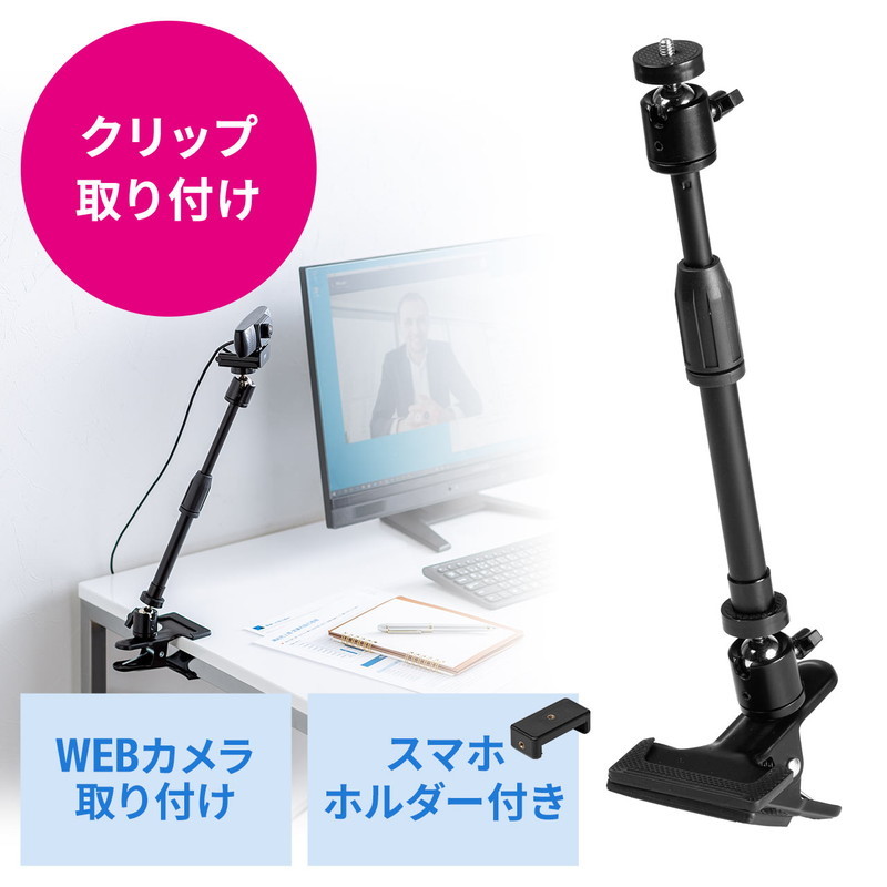 ウェブ会議でウェブカメラを、最適な角度や高さの位置に固定可能なクリップ式のスタンド。付属のスマホホルダーを使えばスマートフォンやiPhoneも設置可能。テレワーク、オンライン授業、動画撮影、動画視聴、動画配信等にも使用可能。