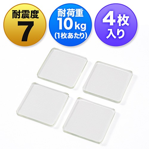 液晶テレビやディスプレイ、パソコンなどの転倒を防ぐ、震度7の地震に対応した四角形耐震ジェル。色がクリアなので、目立ちにくい。水洗い、貼り直し可能。4枚入り。