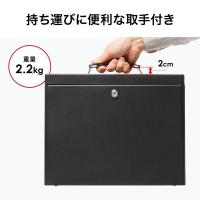 A4サイズの書類を保管できる鍵付きセキュリティボックス。重要書類や貴重品なども入れて保管することができる。持ち運びに便利な取っ手付きで、別途セキュリティワイヤーを購入することでボックス自体の盗難防止できる。ブラック。