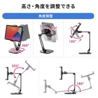 iPadやタブレットを設置できる、タブレットアームスタンド。6インチ、7.9インチ、9.7インチ、10.1インチ、12.9インチなどの13インチまでサイズに対応。2関節アームで高さ調整や角度調整、回転も可能で好きな位置に。ブラック。