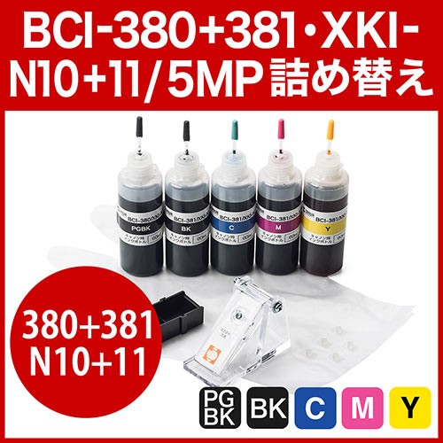 キャノンBCI-380・BCI-381・XKI-N10・XKI-N11対応詰め替えインク。顔料ブラック、染料ブラック、染料シアン、染料マゼンタ、染料イエローの5色パック。工具付き。