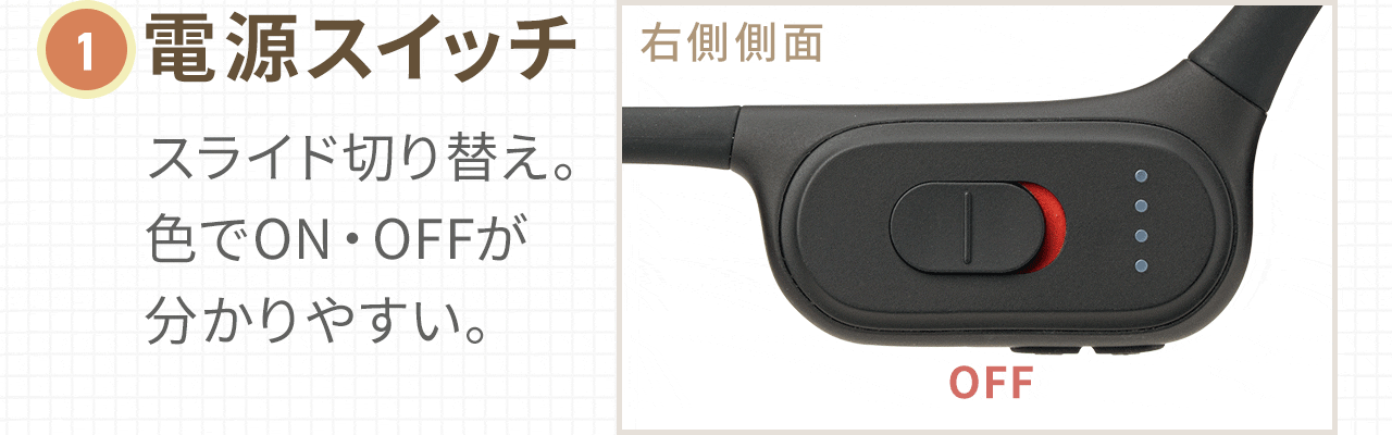 電源スイッチはスライド切替えで、色で電源オンオフが一目で分かるようになっています。