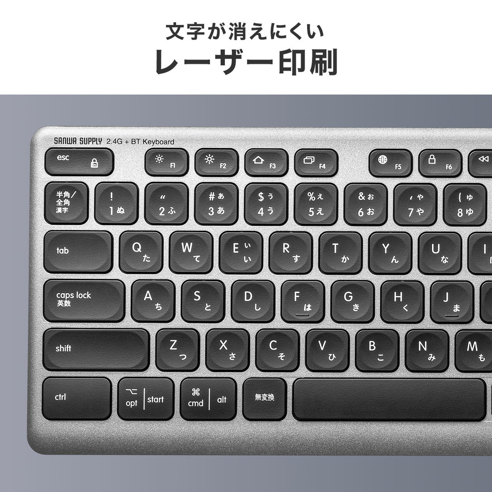 シンプルだけど質感にこだわったフルサイズのワイヤレスキーボード。ガンメタリック×ブラックのツートンカラーが映える、落ち着いたシンプルなデザイン。Bluetooth×2台+USB-Aレシーバー×1台の3台マルチペアリングに対応。キーは凹みのある形状で指先にフィット。UV塗装でさらりと滑らかな触り心地。文字の印字が消えにくいレーザー刻印。ショートカットキーを搭載。パンタグラフ式。USB-C充電式。日本語配列。