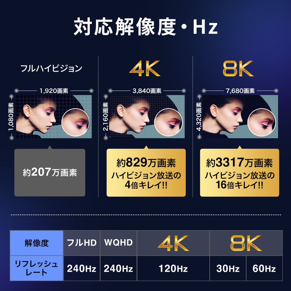 ■対応解像度:8K(7680×4320)/60Hz、8K(7680×4320)/30Hz、4K(3840×2160)/120Hz、5K(5120×2880)/60Hz、1920×1080/60Hz(1080p)、1920×1080/240Hz、2560×1440/240Hz