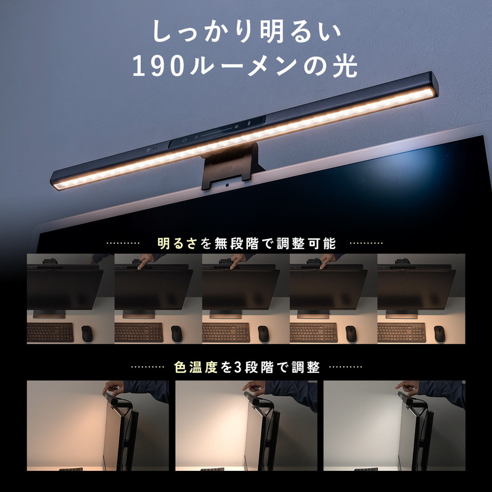センサーでON/OFFができるデスクライト。最大190ルーメンの明るさで、USB電源のモニター賭式LEDライト。湾曲モニターにも設置できるバーライト。