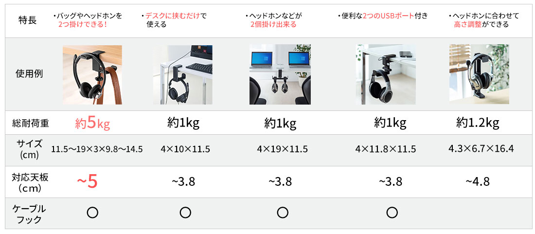■対応機種:ヘッドバンドの幅が60mmまでのヘッドホン・ヘッドセット(重さ約1kgまで)