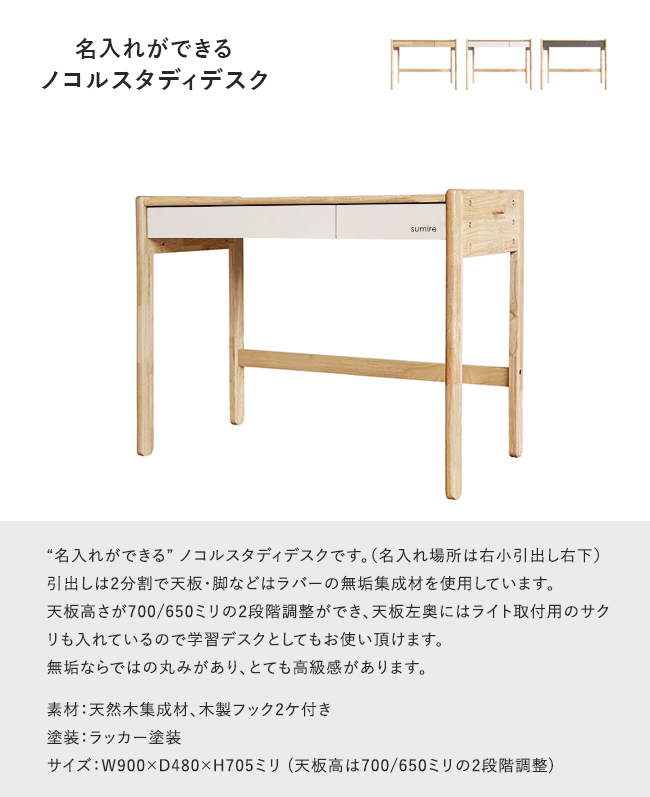 \4/17まで10%OFFクーポン/【名入れ無料】nocoru ノコル スタディデスク 学習机 高さ調節 学習デスク 無垢 平机 子供 デスク