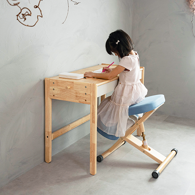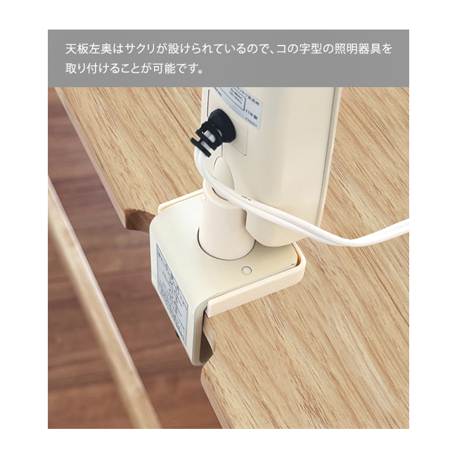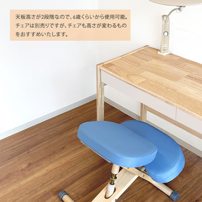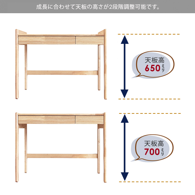 天板高さが700/650ミリの2段階調整ができ、天板左奥にはライト取り付け用のサクリも入れているので学習デスクとしてもお使い頂けます。