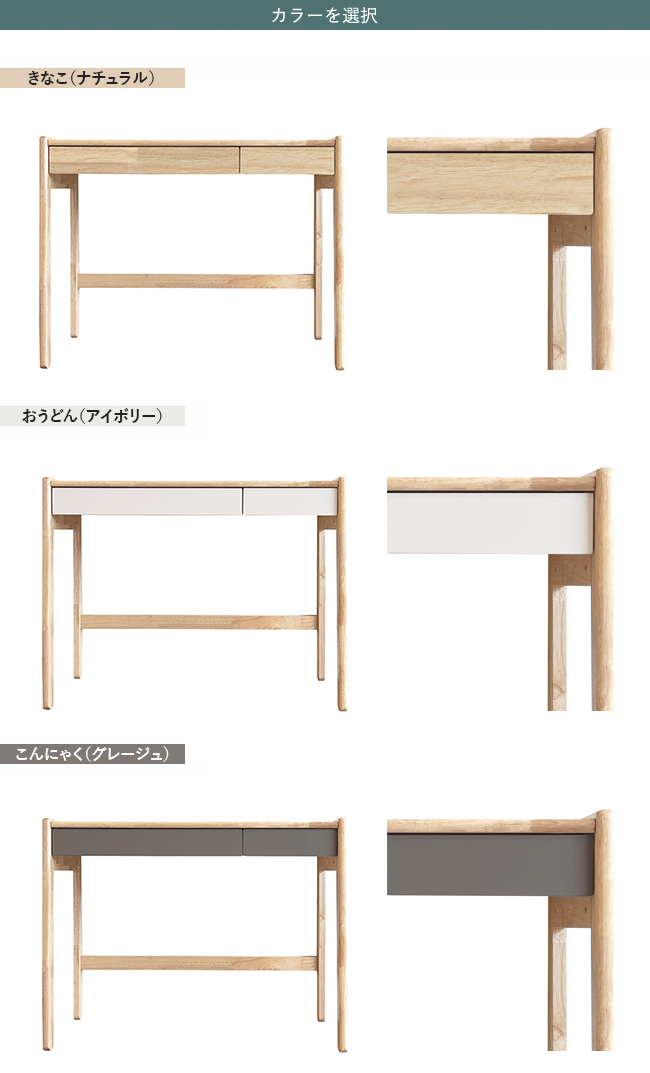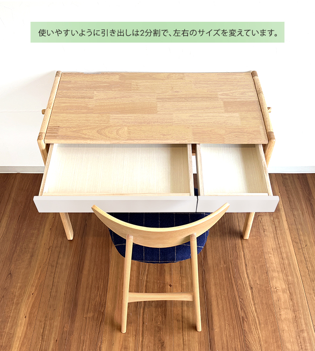 引出しは2分割で天板・脚などはラバーの無垢集成材を使用しています。