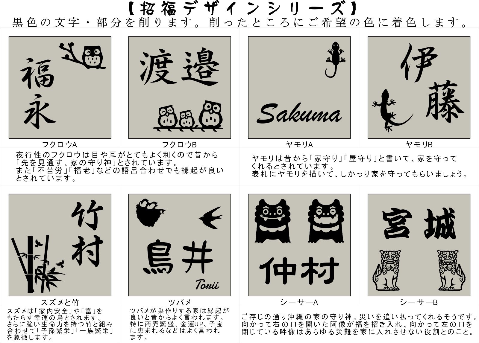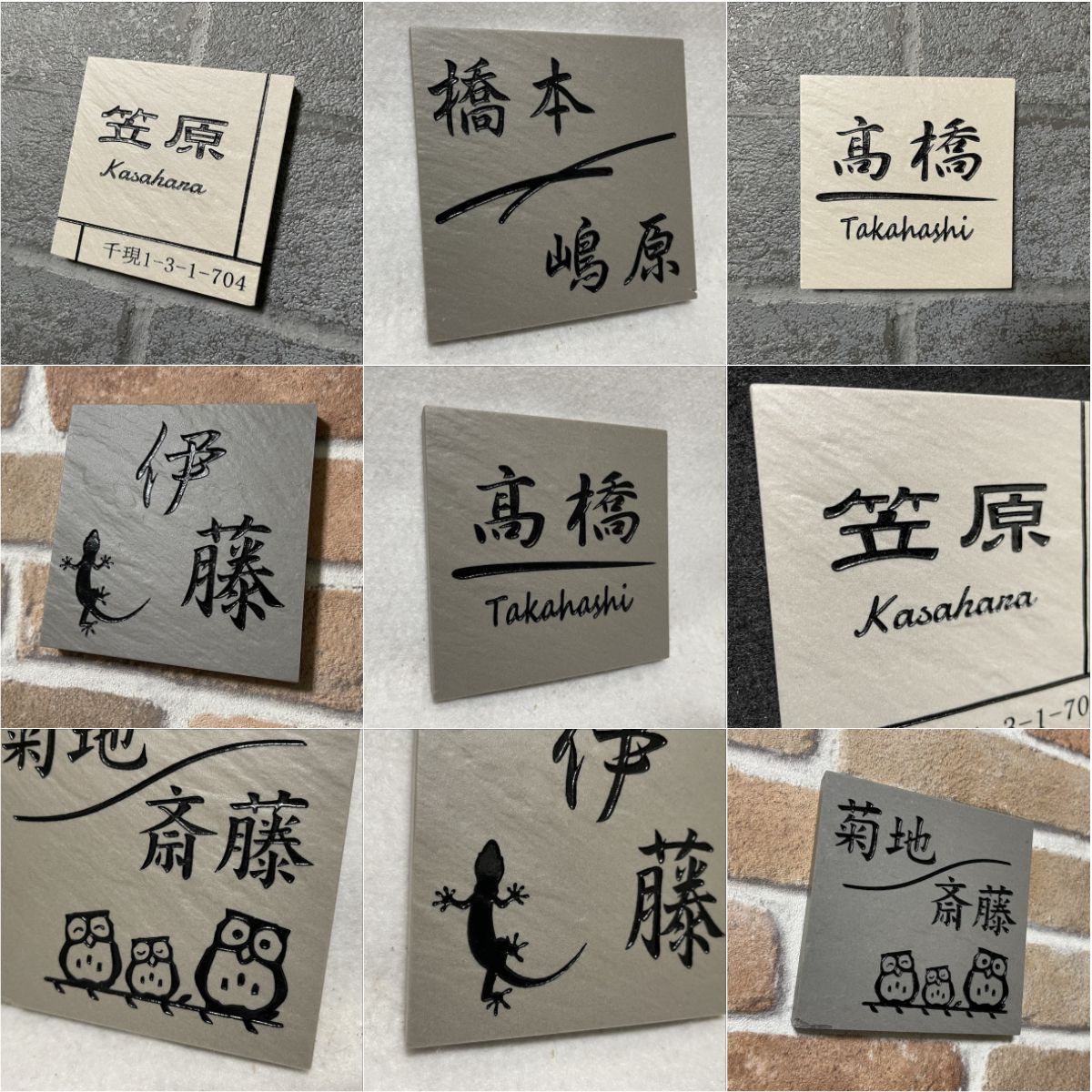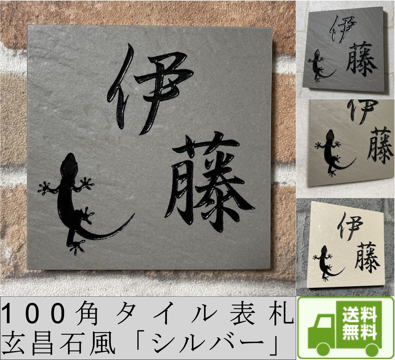 招福デザイン表札 招福動物 フクロウ ヤモリ シーサー 雀と竹 ツバメ 戸建て 石感のあるおしゃれ表札 100角玄昌石風「シルバー」 小さい 追加マグネット可