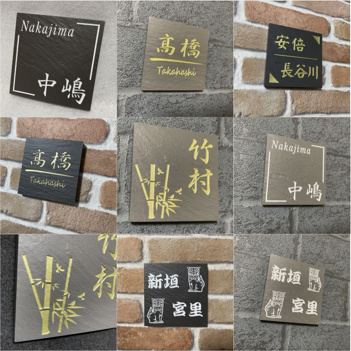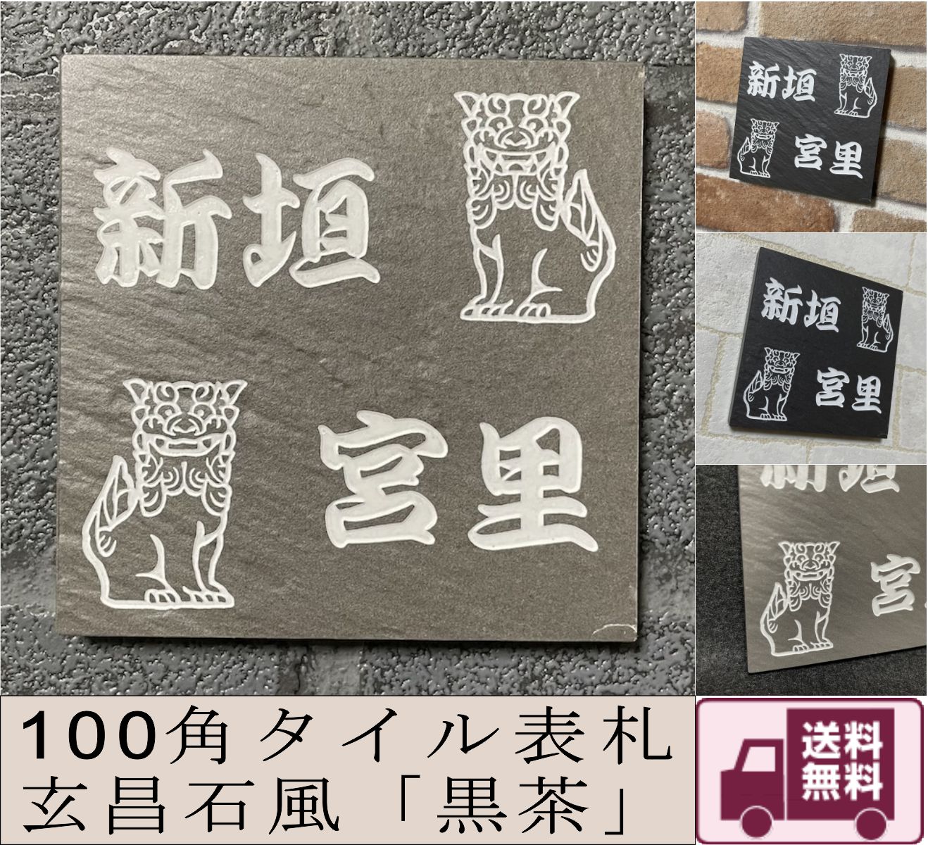 二世帯住宅用に招福デザイン 100角玄昌石風タイル表札「黒茶」 小さい 石感のある表札 戸建て マンション用 おしゃれ 和風 追加マグネット可 ふくろう