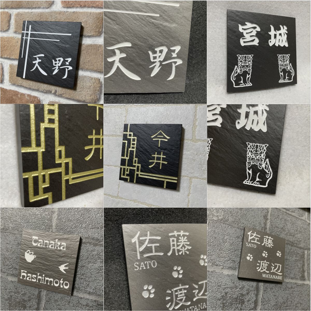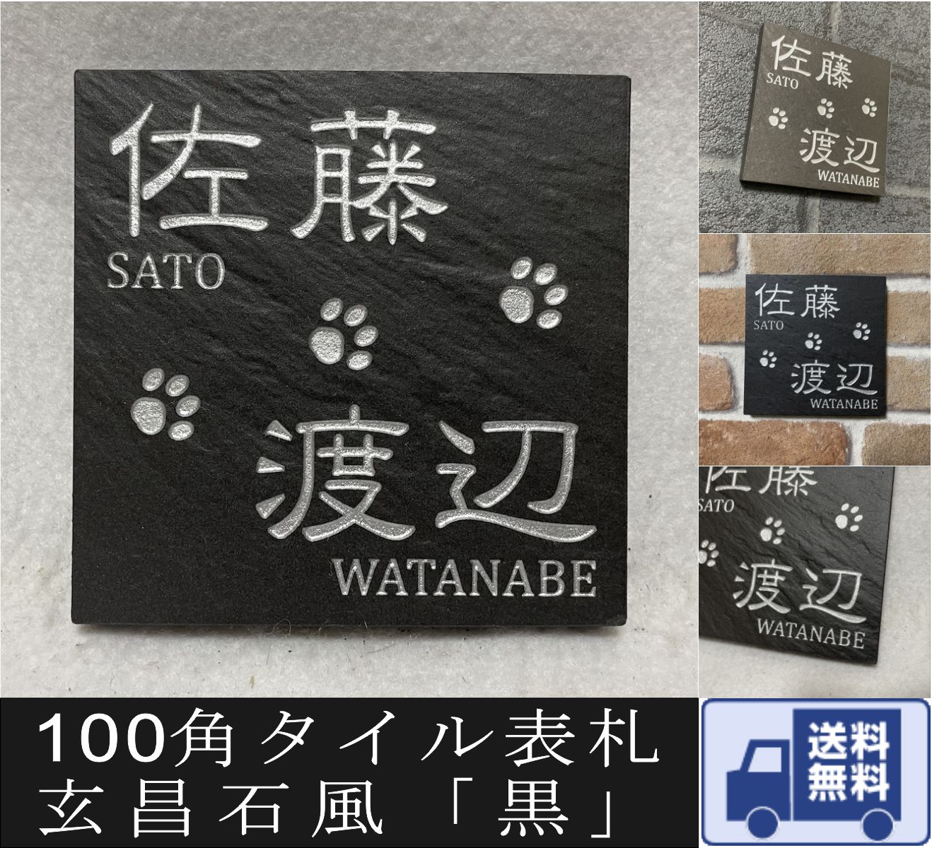 二世帯住宅用デザイン多数 タイル表札 石感のあるおしゃれ表札 100角玄昌石風表札「黒」 小さい 戸建て マンション用 追加マグネット可