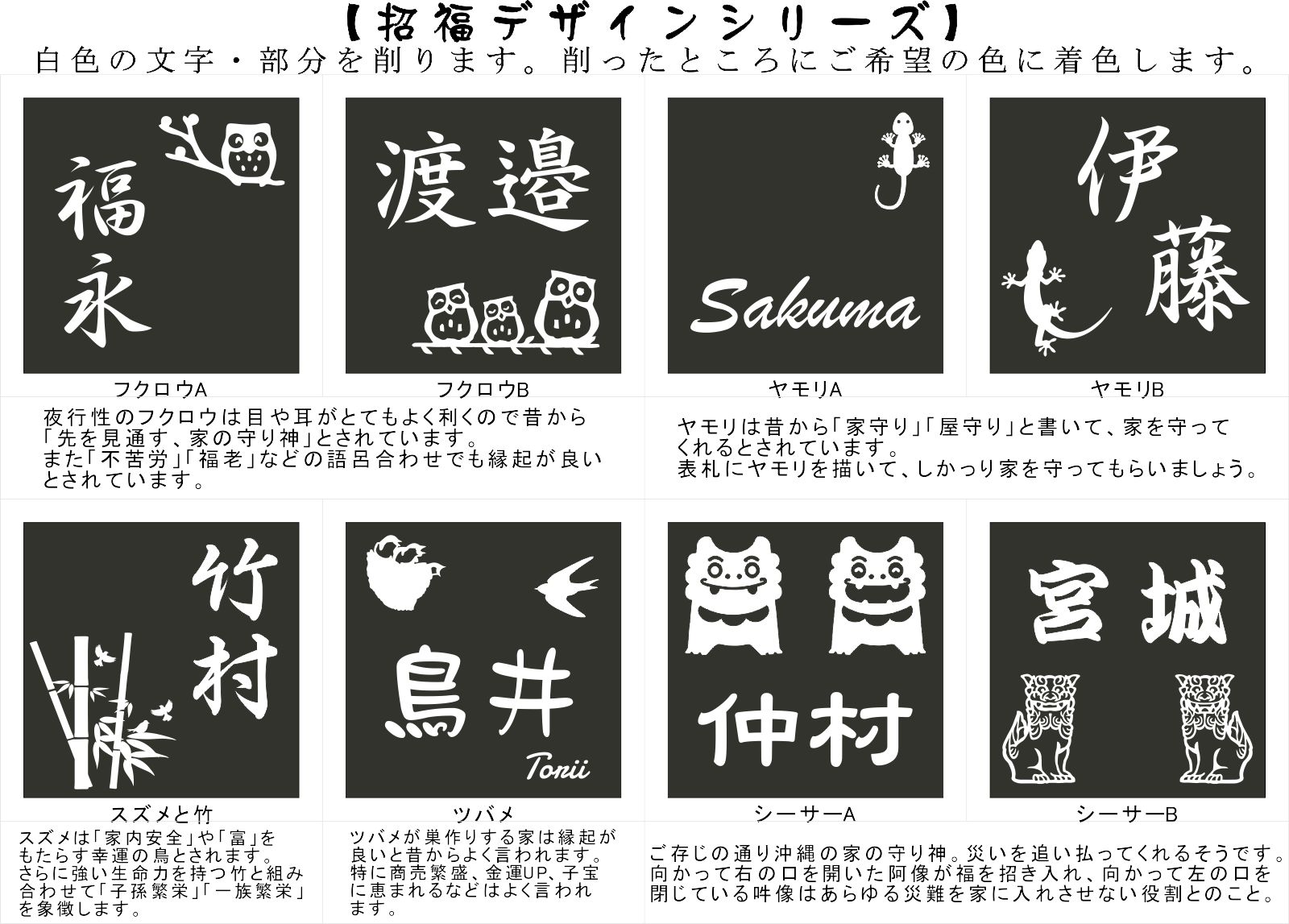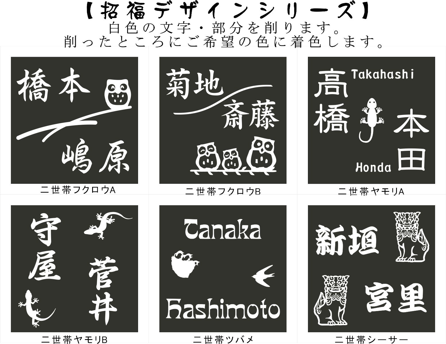 二世帯フクロウ、二世帯ヤモリ、二世帯ツバメ、二世帯シーサー