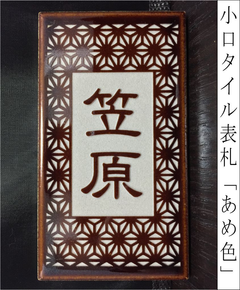 小さい小口タイルをつかった省スペース表札「あめ色」本製品は「108mm×60mm×11mm」の小口タイルに、お名前等をサンドブラスト加工(削り加工)します。