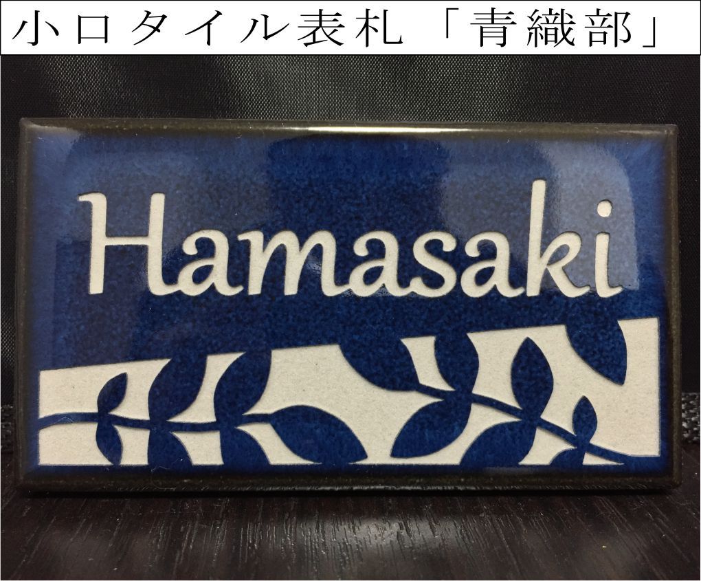 小さい小口タイルをつかった省スペース表札「青織部」本製品は「108mm×60mm×11mm」の小口タイルに、お名前等をサンドブラスト加工(削り加工)します。