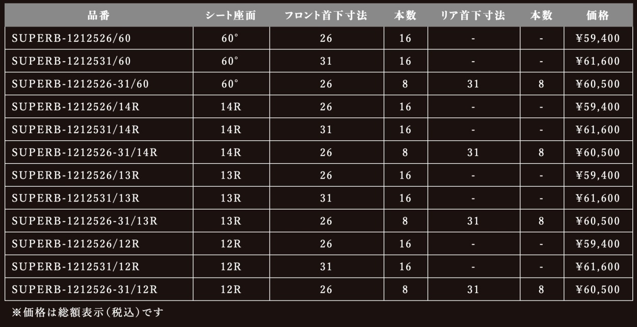 フロントとリアでサイズが異なる商品の組み合わせも販売しております。