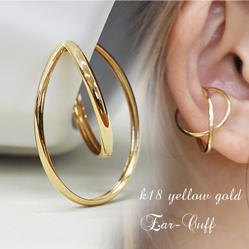 18金 イエローゴールド 大ぶり 地金 痛くなりづらい イヤーカフ k18YG 立体2連サークル フープタイプ 片耳 調節可能