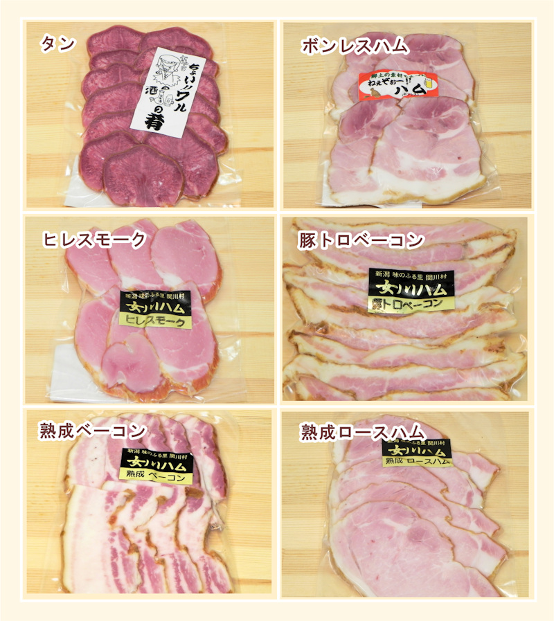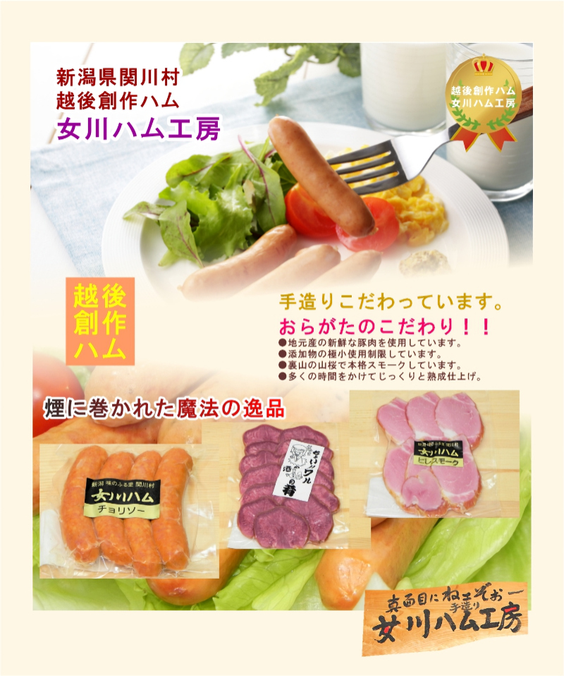 ●原材料:豚肉(新潟県産)、食塩、調味料(アミノ酸等)、発色剤(亜硝酸Na、硝酸k)リン酸塩(Na)、増粘多糖類、(原材料の一部に卵を含む)