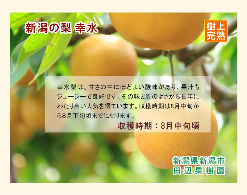 ●幸水梨は、甘さの中にほどよい酸味があり、果汁もジューシーで良好です。その味と質のよさから長年にわたり高い人気を得ています。