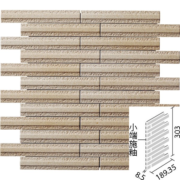 ●25×151角片面小端施釉(短辺)ネット張りは、入隅部分に同一厚さの粒をそろえることで、入隅の凹凸を軽減する役物ですが、意匠がついているため完全にフラットになるわけではありません。
