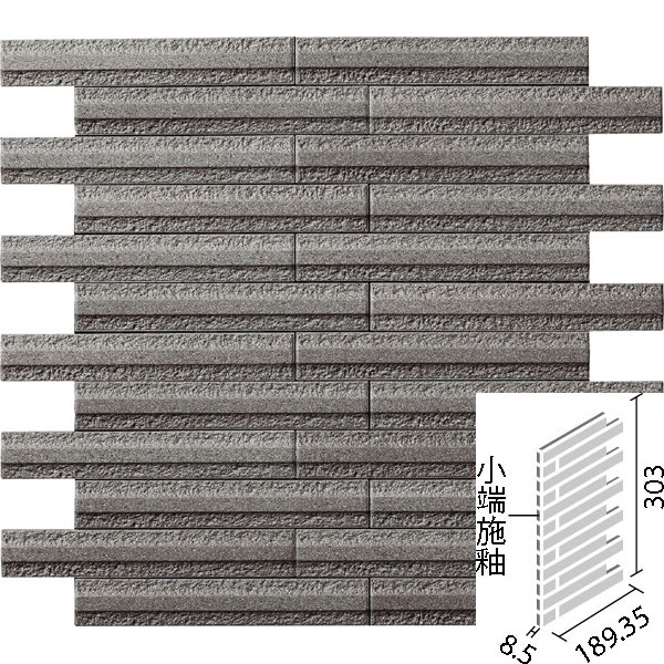 ●25×151角片面小端施釉(短辺)ネット張りは、入隅部分に同一厚さの粒をそろえることで、入隅の凹凸を軽減する役物ですが、意匠がついているため完全にフラットになるわけではありません。