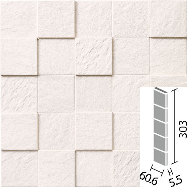 ●60角(納まり役物)は、入隅部分に同一厚さの粒をそろえることで、入隅の凹凸を軽減する役物ですが、意匠がついているため完全にフラットになるわけではありません。