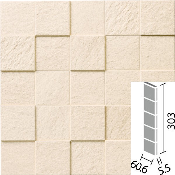 ●60角(納まり役物)は、入隅部分に同一厚さの粒をそろえることで、入隅の凹凸を軽減する役物ですが、意匠がついているため完全にフラットになるわけではありません。