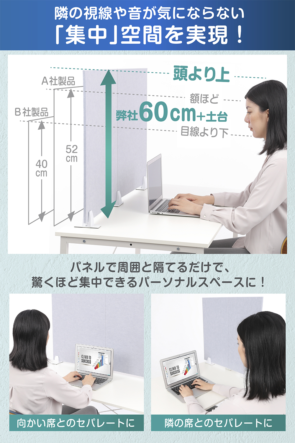 卓上から高さは一般的な40〜50cmでは無く、60cm にアップグレード。完璧に視界をシャットアウト。