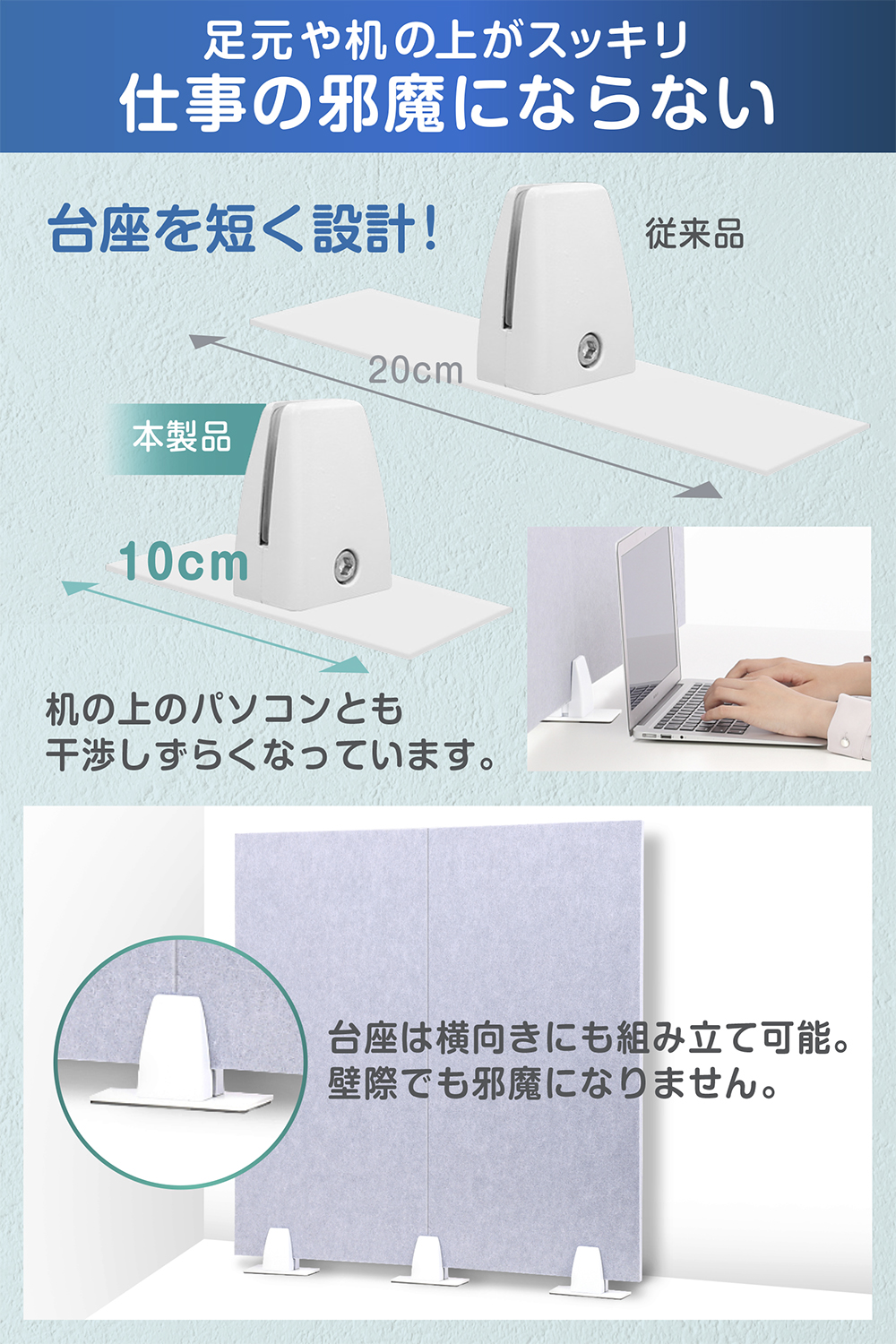 従来比で10cmも短く設計、スッキリと配置。台座は横向きにも組み立て可能、壁際でも使用できます。