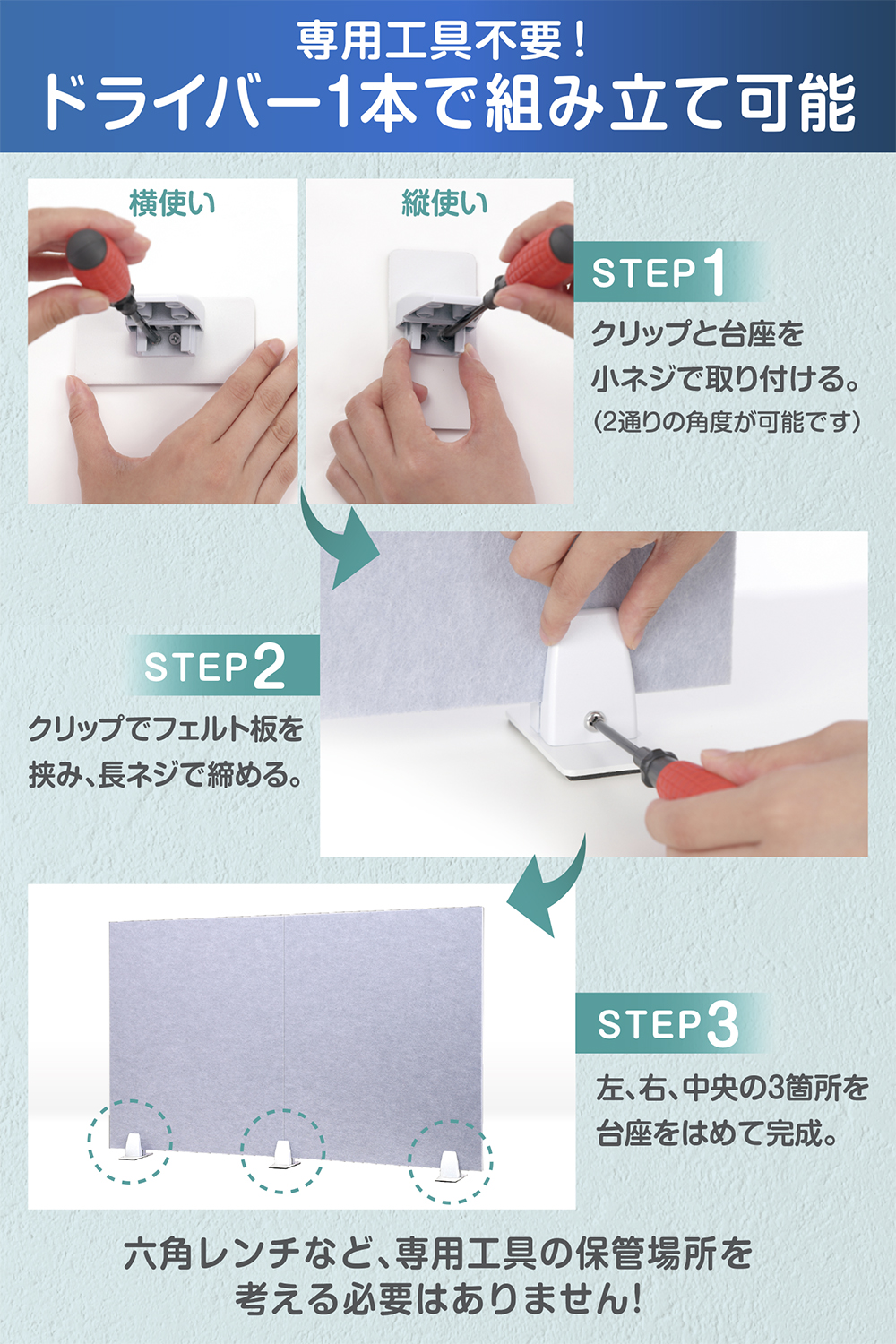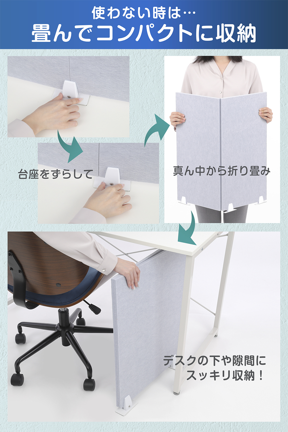 デスクの下にも仕舞えます。商品セット内容: パーテーション本体 1枚、台座(板・クリップ)各3つ、ネジ小 6本、ネジ大 3本 ※ドライバーは付属していません。