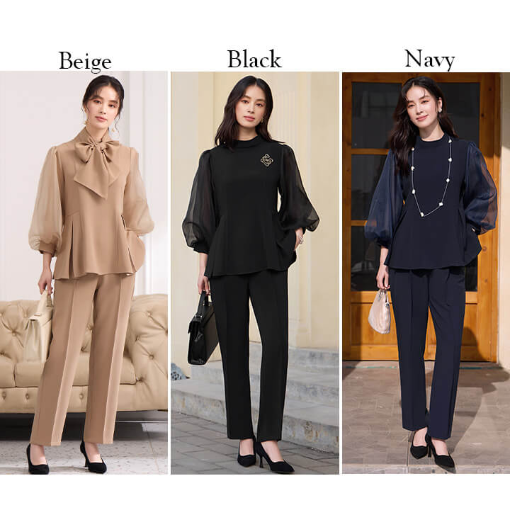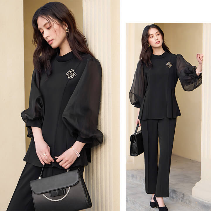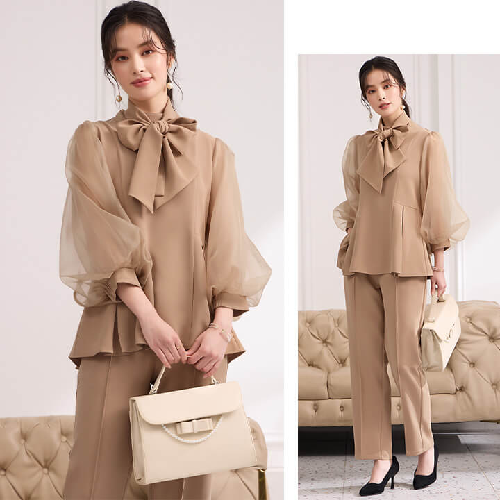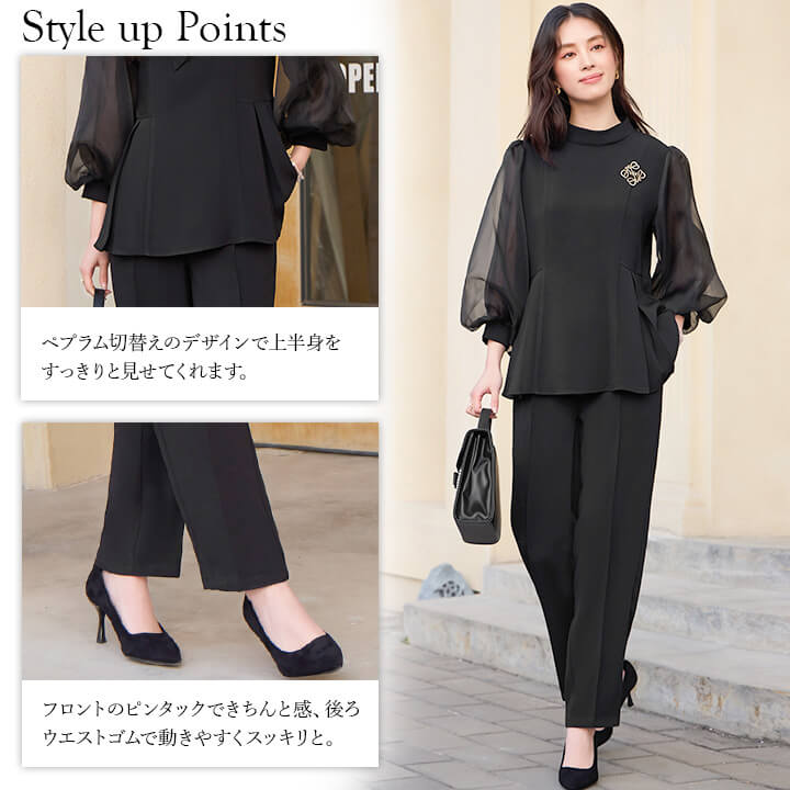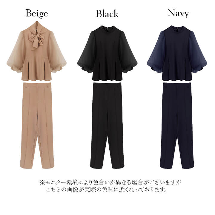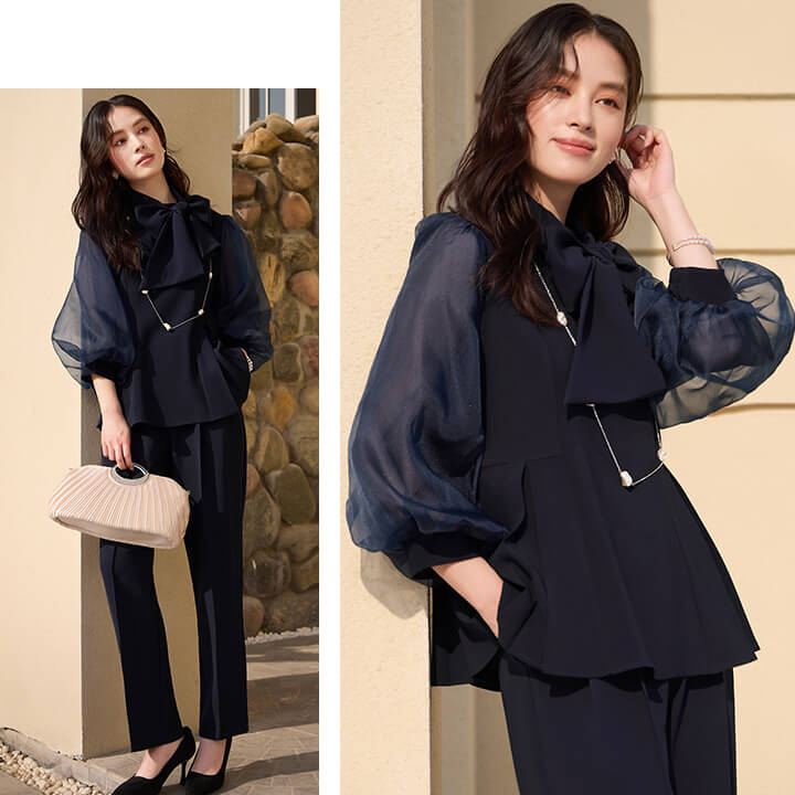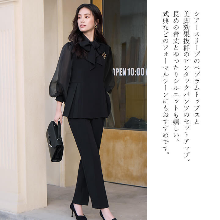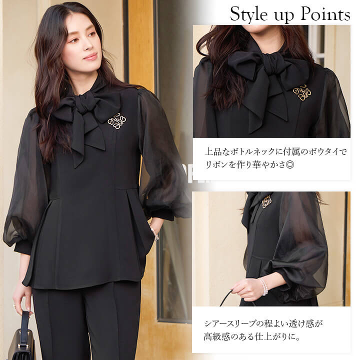 ■シアースリーブのペプラムトップスとピンタックパンツのセットアップ。 ■長めの着丈とゆったりシルエットが嬉しいポイント。 ■上品なボトルネックに付属のボウタイでリボンを作り華やかさ◎ ■式典などのフォーマルシーンにもおすすめです。 | ||||||||||||||||||||||||||||||||||||||||||||||||