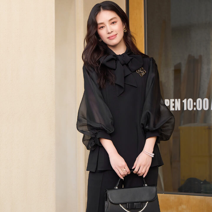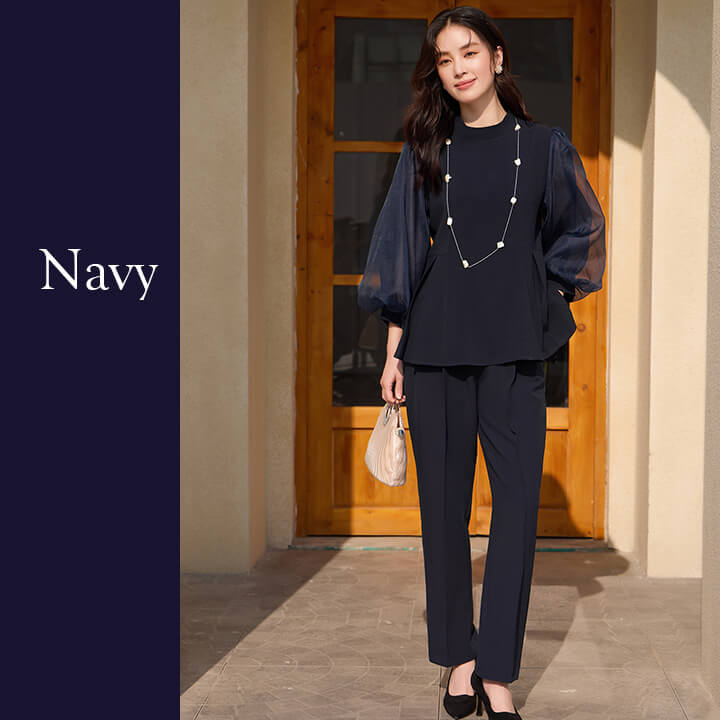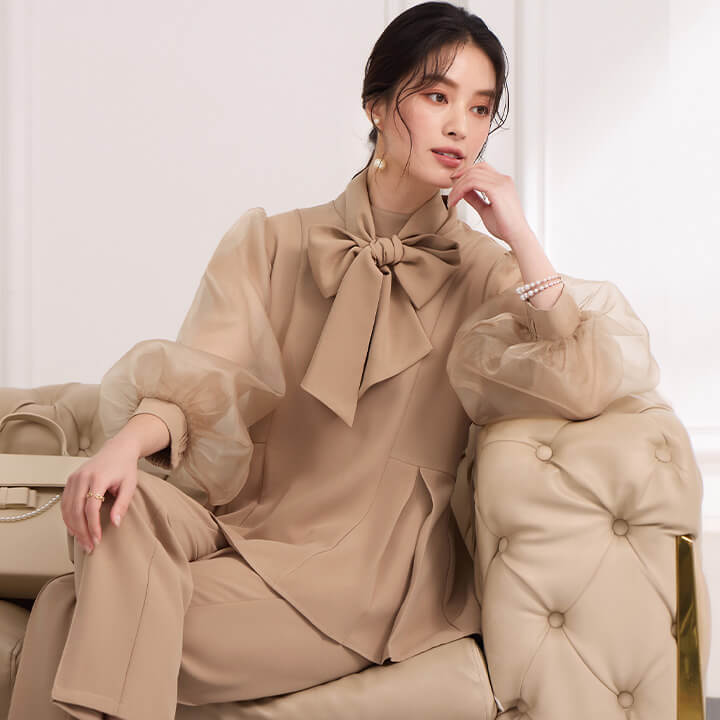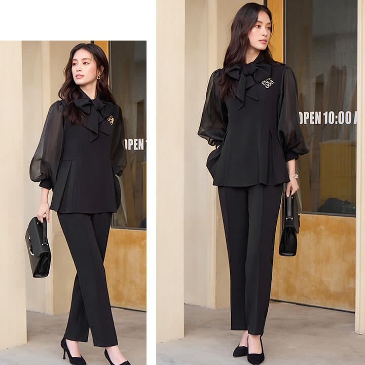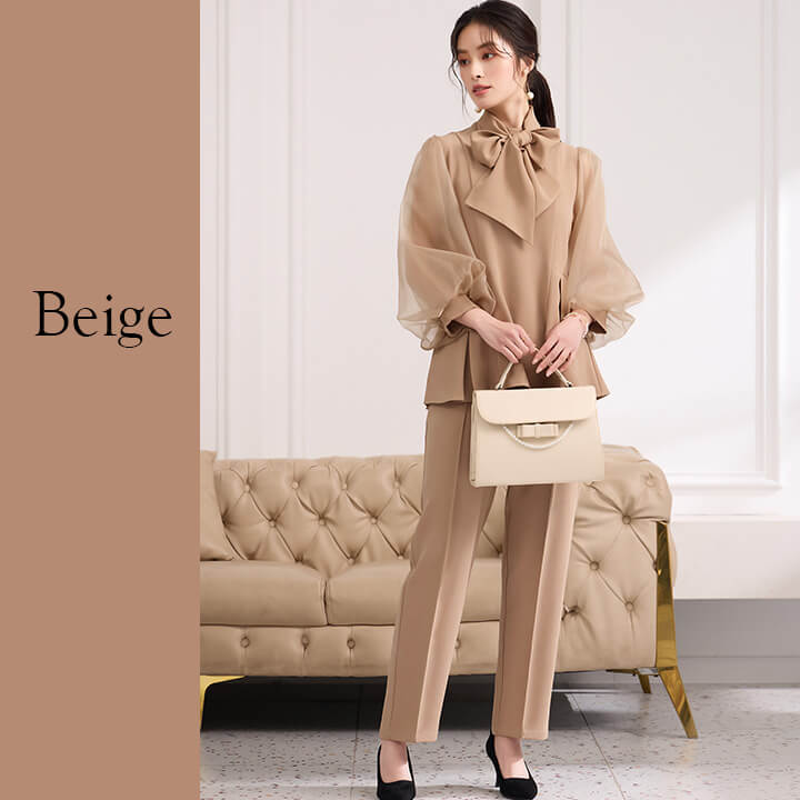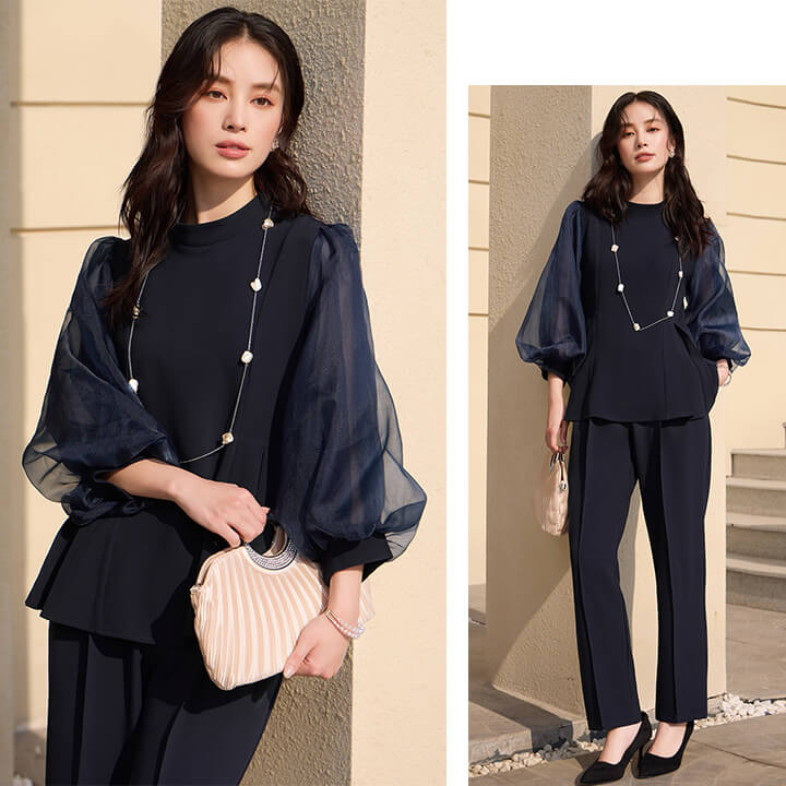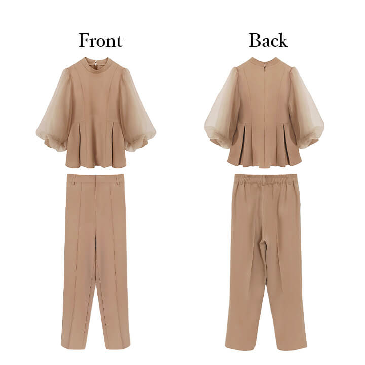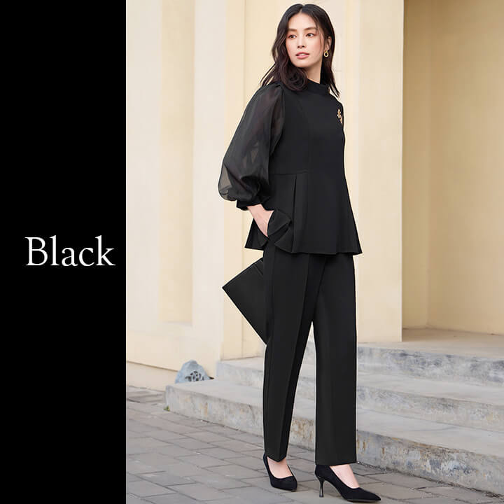 ■シアースリーブのペプラムトップスとピンタックパンツのセットアップ。 ■長めの着丈とゆったりシルエットが嬉しいポイント。 ■上品なボトルネックに付属のボウタイでリボンを作り華やかさ◎ ■式典などのフォーマルシーンにもおすすめです。 | ||||||||||||||||||||||||||||||||||||||||||||||||