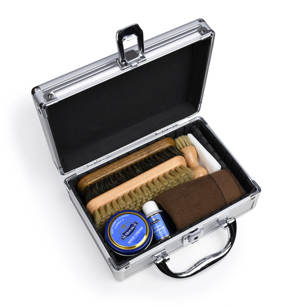 M.モゥブレィのエキスパートセットはアタッシュケース型のアルミケースに靴磨き用品7点が入ったセットになっています。頑丈な作りのアルミケースは持ち運びにも便利です。革靴のお手入れに必要なアイテムが一通り揃っているので、外出先でいつでも靴をピカピカに出来ます。はじめて革靴をはかれる方に、または贈り物にもおすすめです。