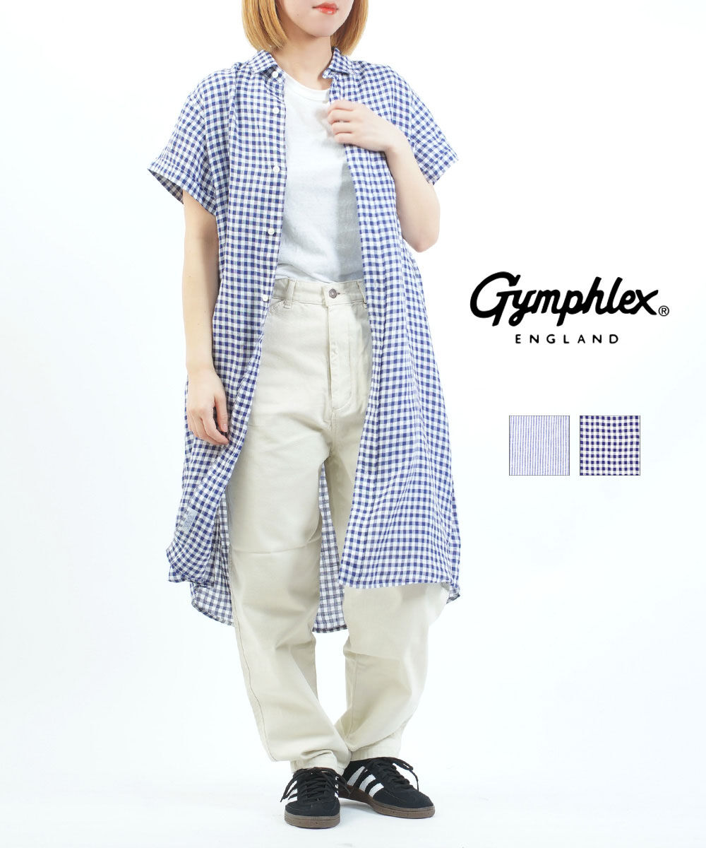 ジムフレックス 半袖 リネン チェック&ストライプ シャツワンピース Gymphlex レディース 国内正規品
