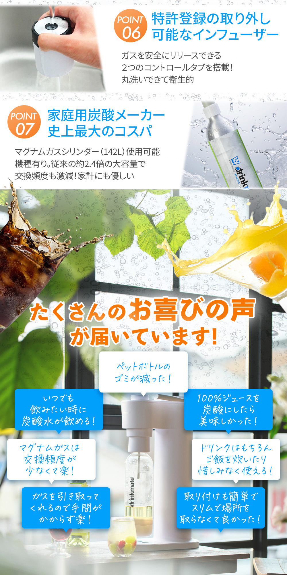 | 仕様 ・ボタン1つで自動注入(オートマチックモデル)・電源に繋がなくてもボタンを押すだけ簡単操作 ・水以外のお好きな飲料にも炭酸を直接注入可能 |