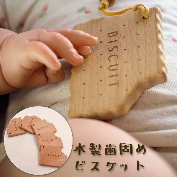 男の子、女の子の出産祝いやハーフバースデイに人気の、ビスケットの形の木製歯固めです。