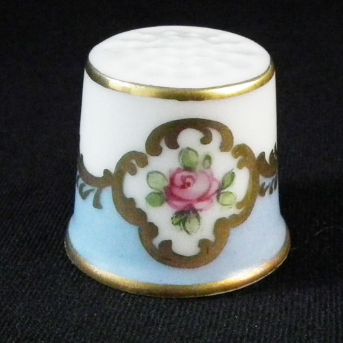 創業1872年、ドイツ、エルベ河沿いの古都に誕生したドレスデン・ポーセラン(ザクセン磁器製作所)は、現在まで熟練の職人によるハンドメイドにより制作されております。磁器製の指貫、柔らかい水色に金の縁取り、窓には可愛らしい一輪の薔薇が描かれてます。内側にはドレスデンのブルーのロゴ入り。アンティーク調のデザインで非常に上品です。コレクションボードのアクセントにもお勧めです。コレクションとしていろいろな柄を蒐集される方にもお勧めです。高さ約2cm、内側にブランドロゴ入り、新品。このような小さなものは、絵が凝縮し美しさがより引き立つように感じます。取り扱い中止のため、在庫1点限りのSALE価格となっておりますので、お見逃しなく!