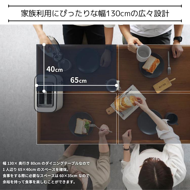 1300mmの広めの天板は食事や作業、趣味の時間にも使いやすく、家族みんなでゆったり過ごせます。