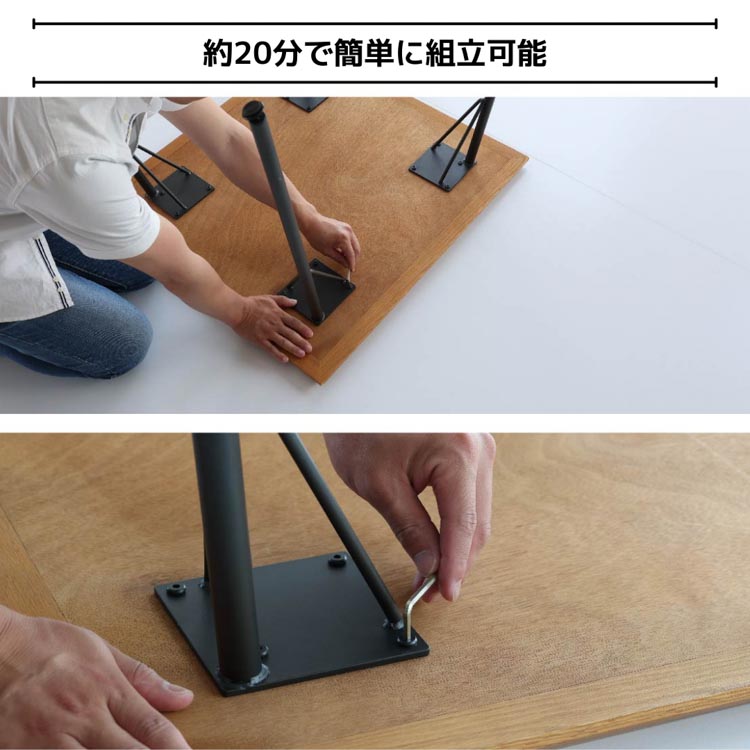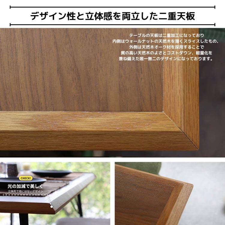 天板:天然木(オーク材).天然木化粧繊維板(ウォールナット材).脚:金属(スチール)